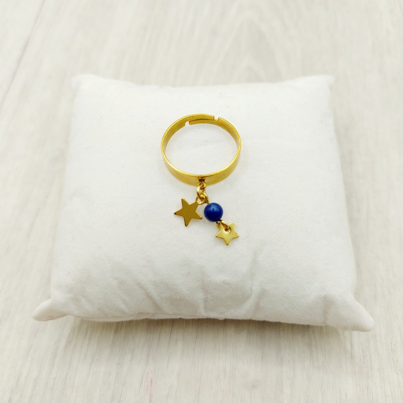 Évoquant le ciel nocturne constellé d’étoiles, cette bague en Lapis-lazuli célèbre la clarté mentale et la vérité intérieure. Les étoiles dorées qui l’accompagnent symbolisent les guides invisibles, ces intuitions subtiles qui éclairent le chemin lorsque l’esprit s’apaise.