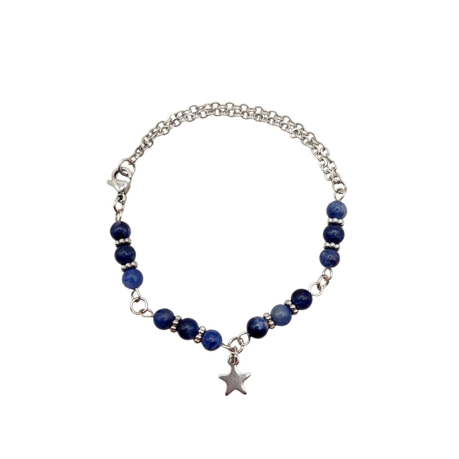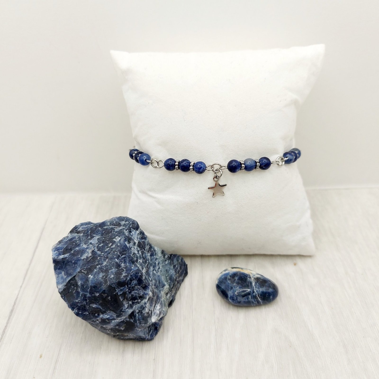 Monté sur une structure en acier inoxydable, le bracelet Sodalya allie l’élégance intemporelle de l’inox, à l’élégance envoûtante des pierres naturelles, pour celles et ceux qui recherchent à la fois un bijou chic et énergétique.