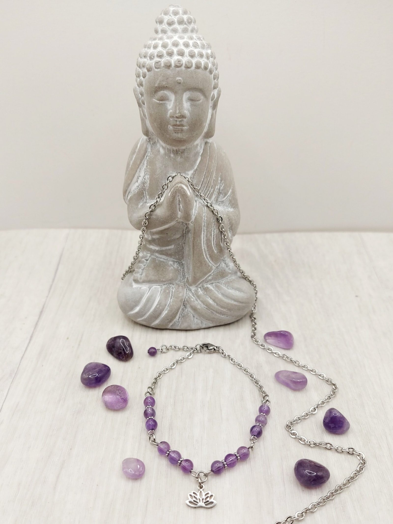 Le bracelet est composé d’améthyste naturelle, aux nuances de violet qui rayonnent avec le chakra coronal et invitent à la sérénité. Sa petite fleur de lotus symbolise l’harmonie et se marie parfaitement aux vertus spirituelles de l’améthyste. Son design en acier inoxydable, durable et respectueux de la peau, apporte une touche raffinée et se porte pour toutes les occasions Avec sa chaine réglable, il convient aux poignets fins et épais.
