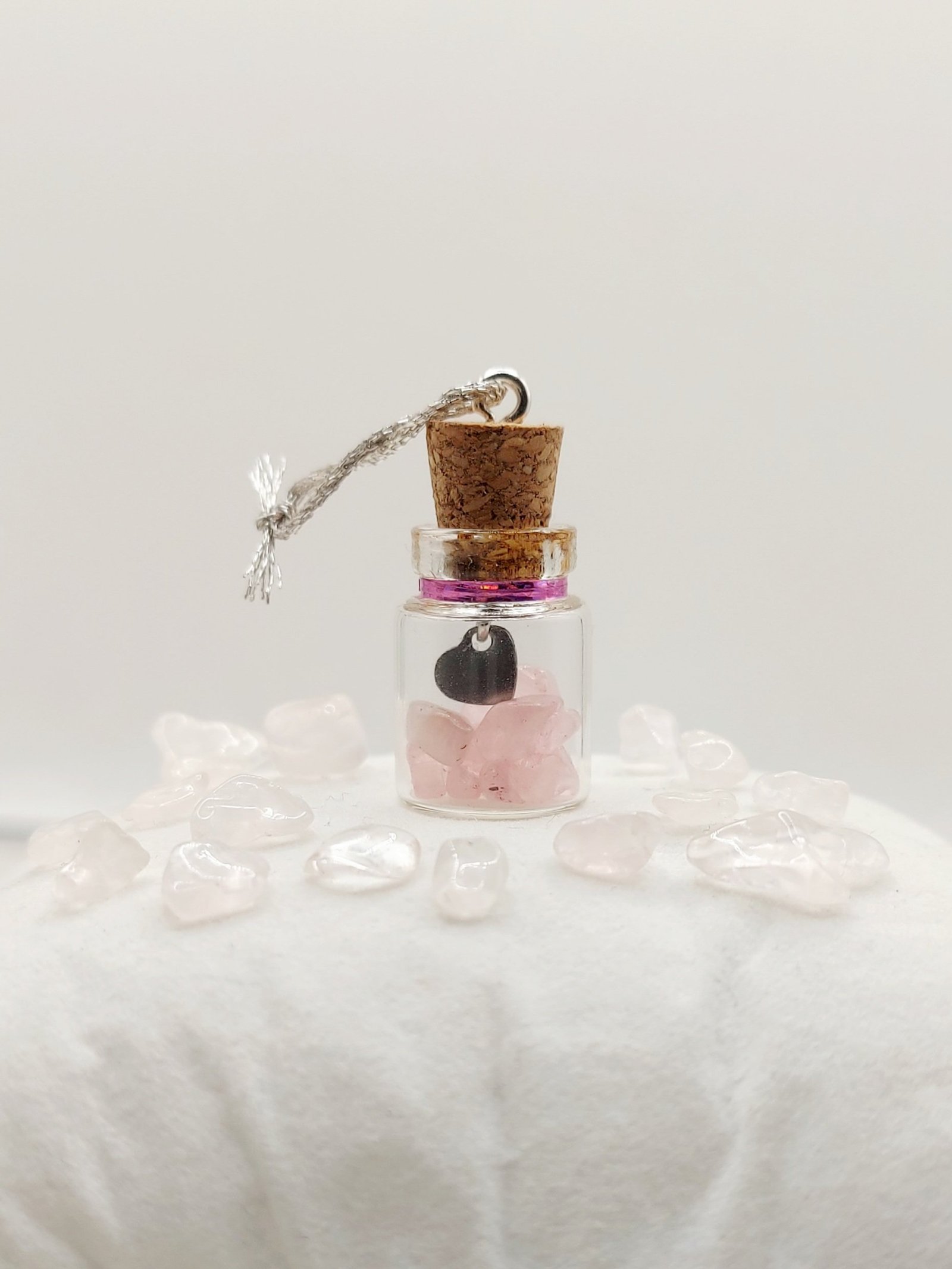 Une fiole à souhait, remplie d’amour et d’éclats de quartz rose. (Secoue-la doucement et fais un vœu…)